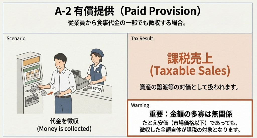 一方、従業員から代金を受け取って食事を提供した場合は、その徴収する食事代金が「課税資産の譲渡等の対価」と見なされ、消費税の課税対象となります。