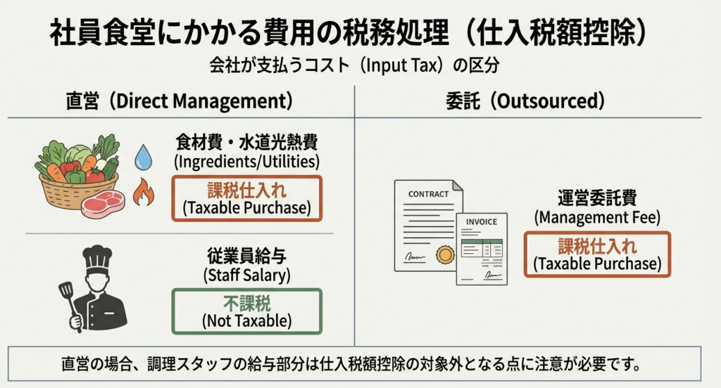直営の社員食堂における課税仕入れには、原材料の購入代金や水道光熱費などが該当します。また、業者に運営を委託している場合は、その運営委託費が課税仕入れとなります。