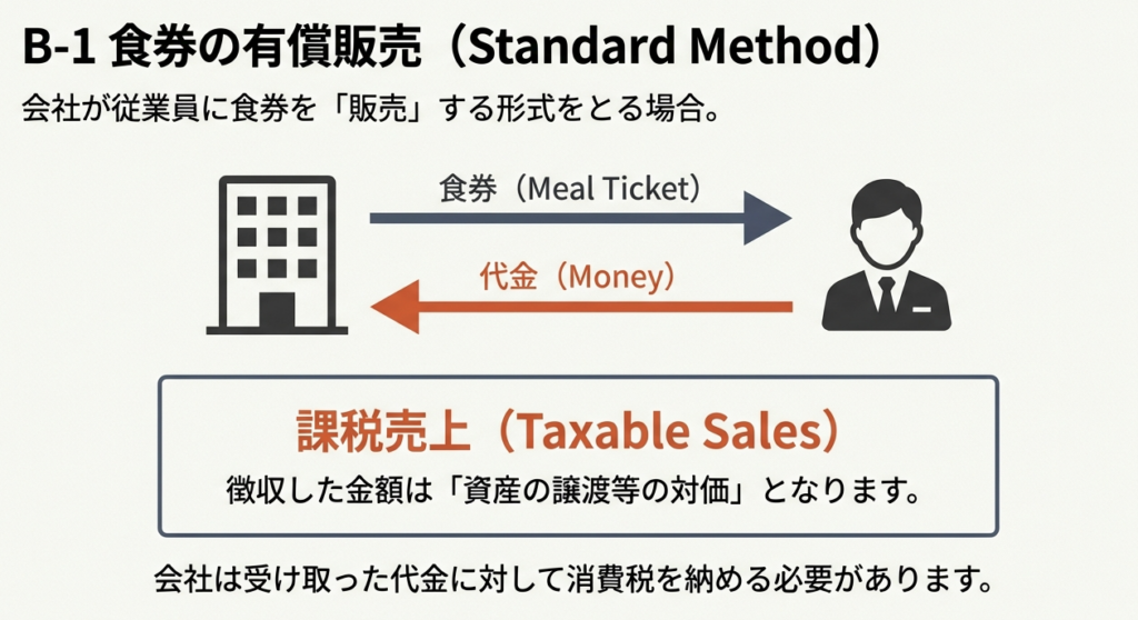 会社が外部の食堂と契約し、その食堂で利用できる食券を従業員に有償で販売した場合、原則として、その販売行為は資産の譲渡等に該当します。したがって、従業員から徴収した食券代金は消費税の課税対象となります。