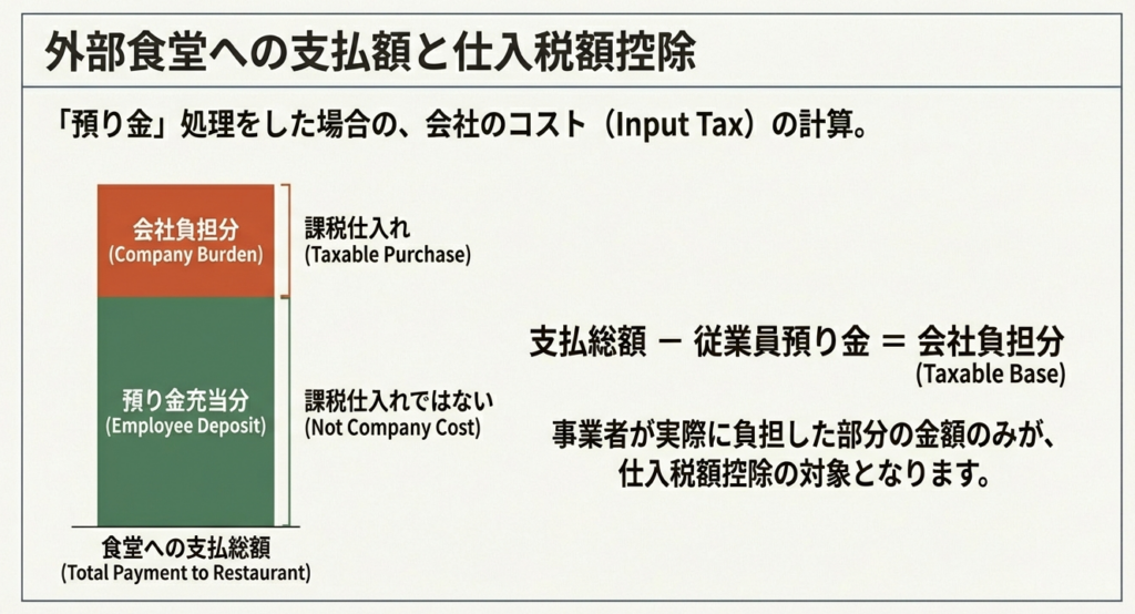 従業員から預かった金額を除いた、**「事業者が実際に負担した部分の金額のみ」**が課税仕入れの対象となります。顧問先の皆様からよくご質問をいただく具体例で見てみましょう。例えば、500円の食事代のうち、従業員から300円を預り金として徴収した場合、課税仕入れとして計上できるのは会社負担分の200円のみです。
