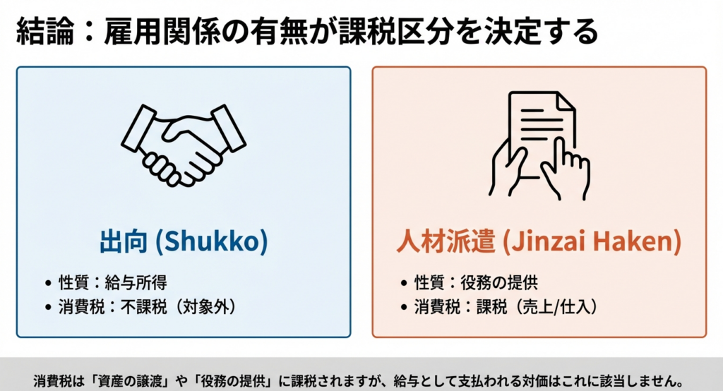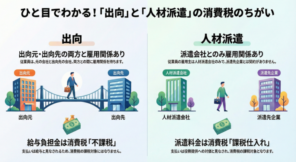 出向と人材派遣における消費税の取扱いの違いは、その取引が「給与の支払(不課税)」と見なされるか、「役務の提供(課税)」と見なされるかという、契約形態の本質的な違いに起因します。以下の表は、その核心的な違いをまとめたものです。