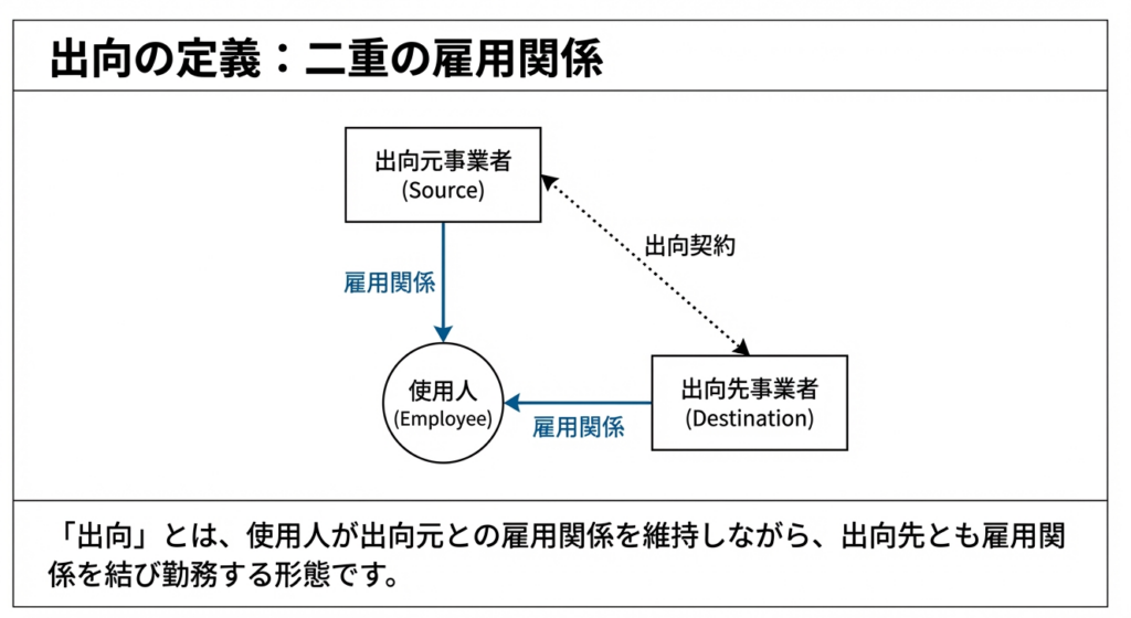 出向とは、派遣される使用人等が出向元事業者との雇用関係を維持しつつ、出向先事業者との間でも雇用関係を結び勤務する形態を指します。つまり、使用人は出向元と出向先の両方と雇用関係を持つことになります。