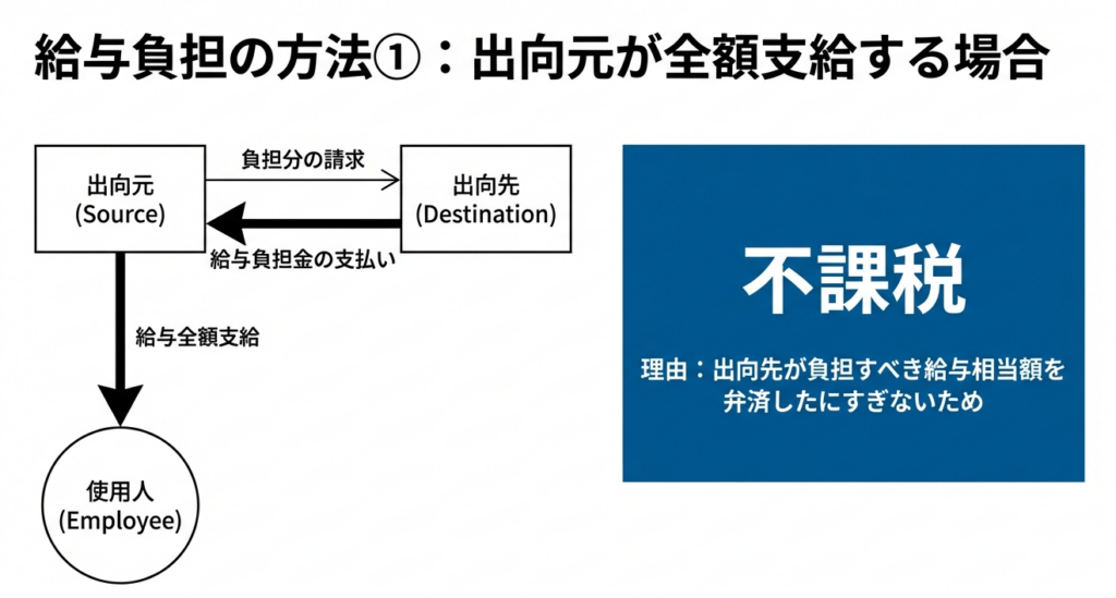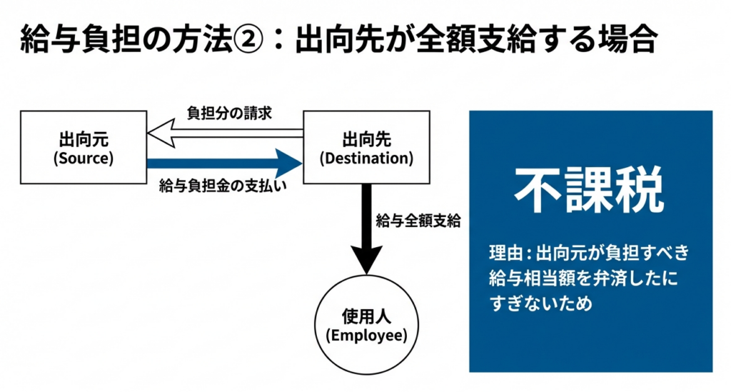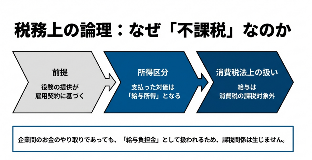 いずれの給与負担方法であっても、その支払いは実質的に出向者に対する給与の支給と見なされるためです。給与は課税仕入れの対象外であるため、支払い方法が異なっても消費税の課税関係は生じません。