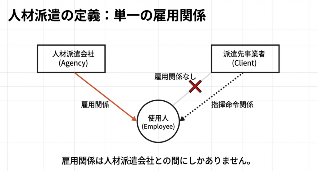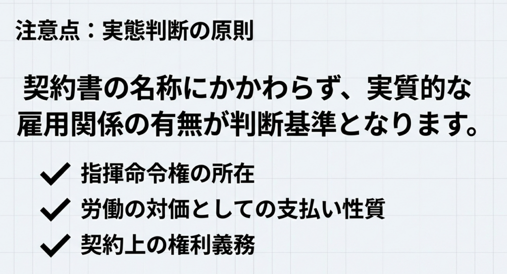 取引の名称(例えば「業務委託契約」など)に惑わされてはいけません。重要なのは、その契約の実態が労働者との間に「雇用関係」を成立させるものか、あるいは事業者間の「役務提供契約」なのかという点です。契約書の内容を精査し、指揮命令権や雇用責任の所在を必ず確認してください。