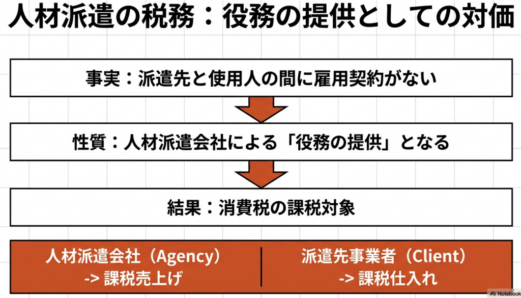 人材派遣では、派遣された使用人と派遣先事業者の間に直接の雇用契約がありません。そのため、この関係は人材派遣会社が自社の従業員を使って派遣先事業者にサービス(労働力)を提供するという、事業者間の取引と見なされ、「役務の提供」に該当します。