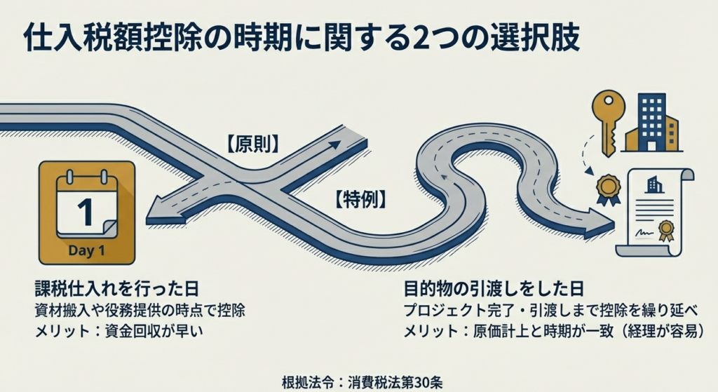 この論点に対する消費税法上の取り扱いには、明確な「原則」と、継続適用を条件とする「例外」の2つの処理方法が存在します。どちらの方法を採用するかによって、仕入税額控除のタイミングが大きく変わるため、自社の経理方針を正しく把握することが不可欠です。