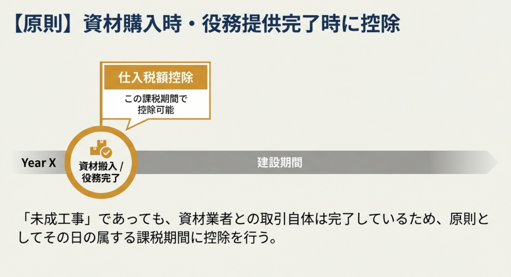 原則として、工事の完成を待たず、資材の引渡しや下請けの役務提供が完了した日の属する課税期間において、仕入税額控除の対象とします。