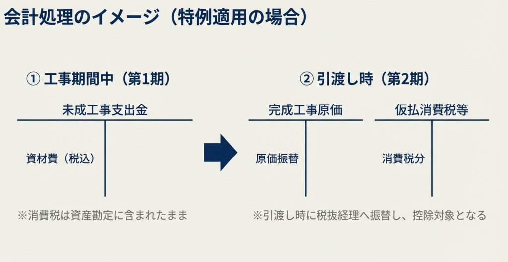 特例的な処理方法として、未成工事支出金として経理した課税仕入れの金額を、請負工事による目的物の引渡しをした日の属する課税期間の課税仕入れとして処理することが認められています。