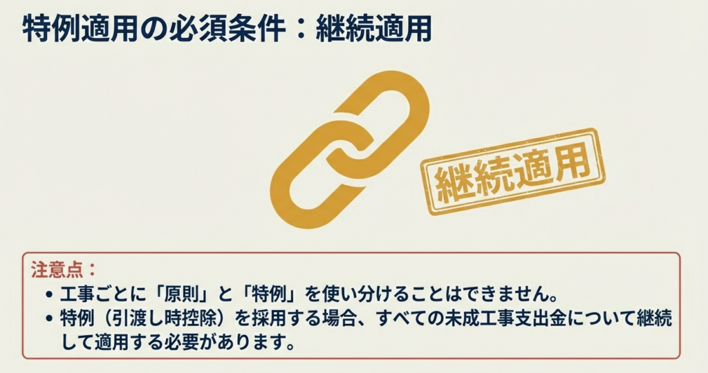 ただし、この例外処理を選択する上で、絶対に忘れてはならないのが**「継続適用」という鉄則**です。一度この方法を採用した以上、税務上の有利不利によって毎期処理方法を変えるといった恣意的な運用は一切認められません。