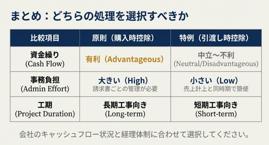 ◦ デメリット: 税額控除のタイミングが遅れ、キャッシュフロー上は不利になる場合がある。