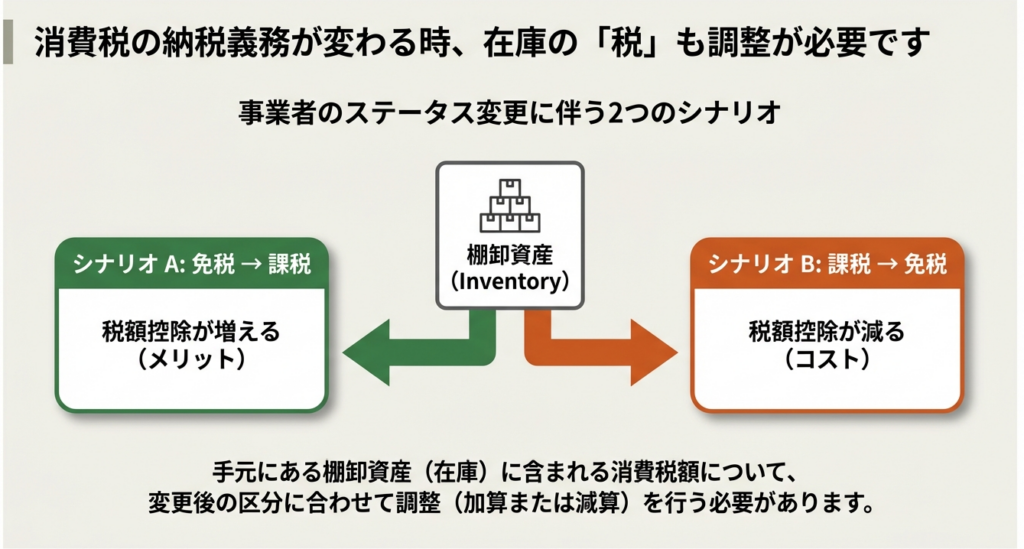 企業の成長に伴う売上増加や、インボイス制度への対応といった経営戦略上の判断により、事業者の消費税における立場(課税事業者か免税事業者か)は変わり得ます。このような転換期において、経理実務担当者が特に注意を払うべき重要な論点の一つが、期末に保有する棚卸資産にかかる消費税の調整です。