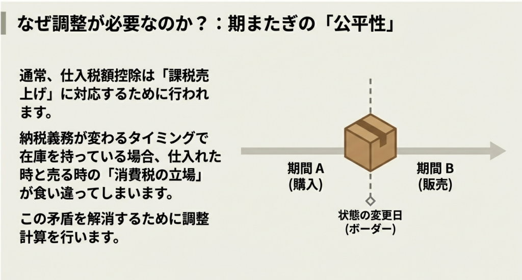 このルールの背景には、税制の公平性を保つという目的があります。もしこの調整がなければ、事業者は課税事業者である期間中に仕入税額控除を受けた商品を、免税事業者になった後に消費税を課さずに販売できてしまいます。これは、実質的に消費税の還付だけを受けて納税義務を免れるという不公平な結果につながるため、それを防ぐための規定です。