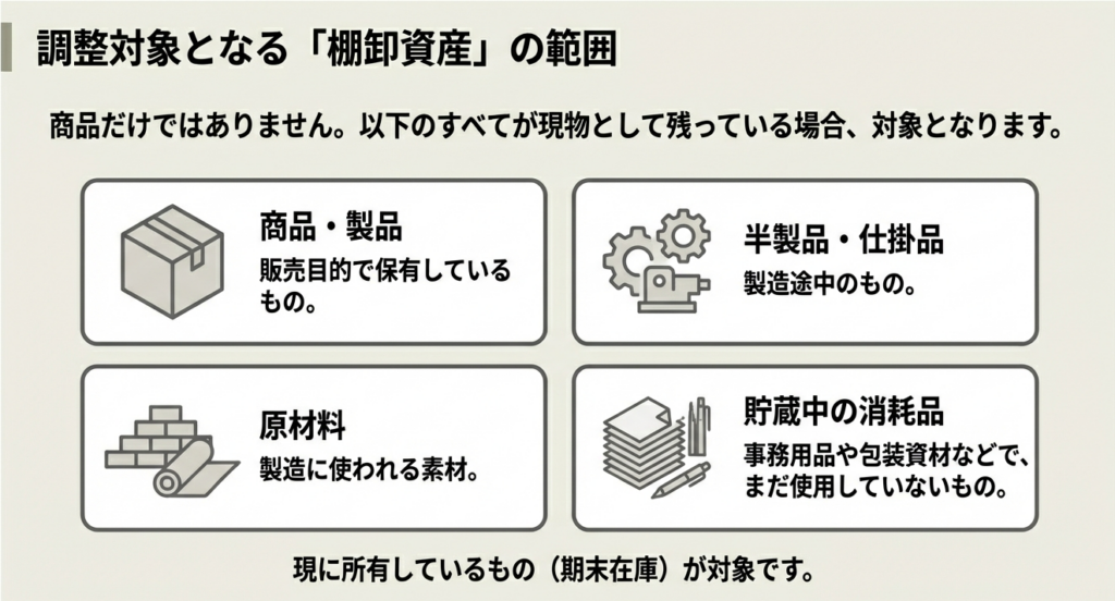 調整対象となる棚卸資産には、商品、製品、半製品、仕掛品、原材料、貯蔵中の消耗品等で、事業者が現に所有しているものが含まれます。