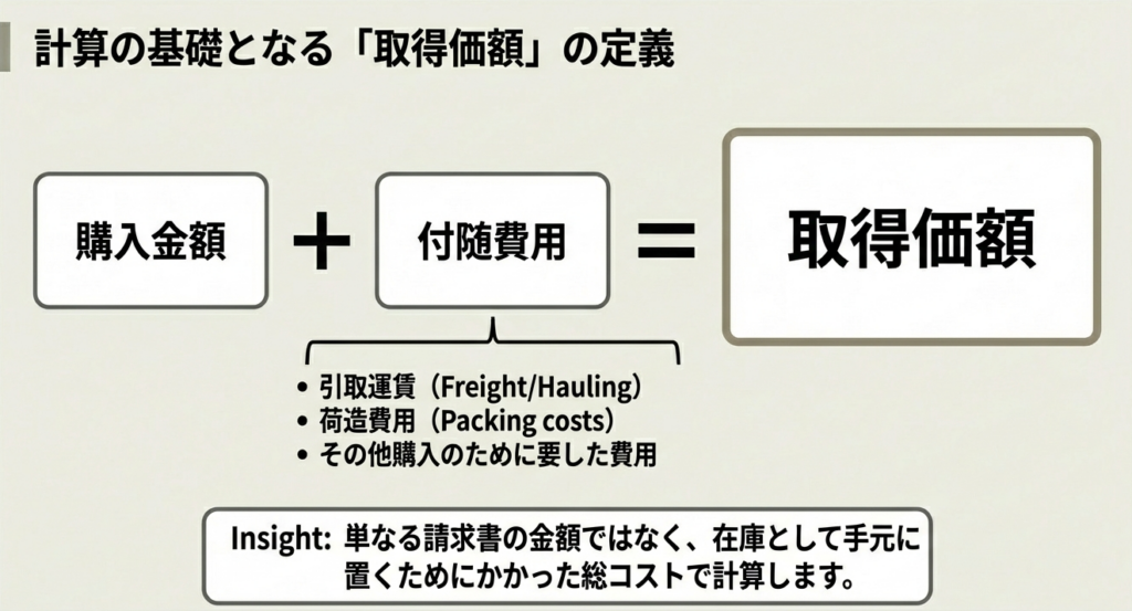 棚卸資産の取得価額には、購入金額本体のほか、引取運賃、荷造費用、その他その資産を購入するために要した費用の額が含まれます。
