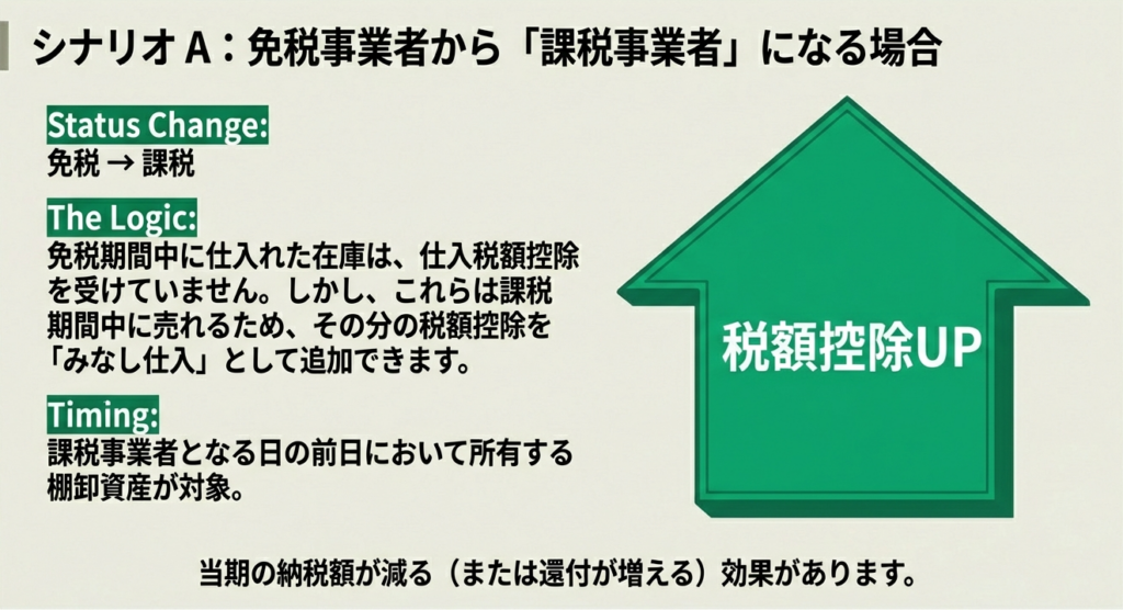 免税事業者であった期間中に仕入れた棚卸資産がある場合、その棚卸資産に係る課税仕入れ等の税額を、課税事業者となった課税期間の仕入控除税額の計算に含めることができます。これにより、課税事業者として商品を販売する際に、仕入れ時に支払った消費税額を控除することが可能になります。