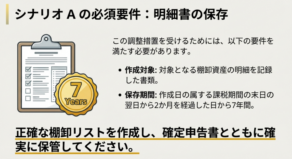 事業者は、対象となる棚卸資産の明細を記録した書類を作成し、その作成した日の属する課税期間の末日の翌日から2か月を経過した日から7年間保存する必要があります。