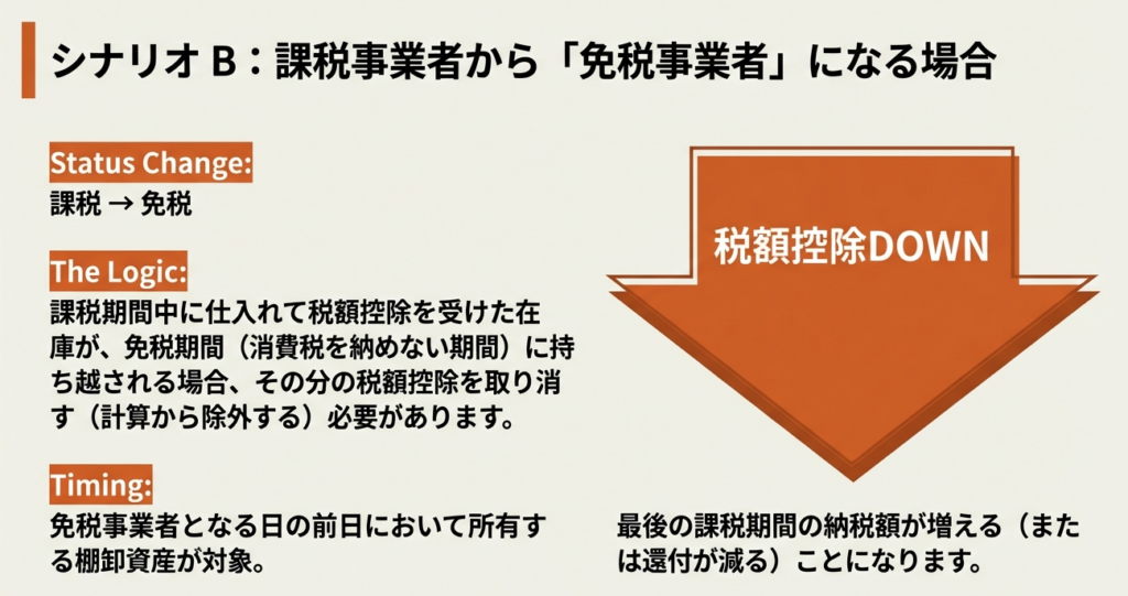 課税事業者が免税事業者になる場合、その直前の課税期間中に仕入れた棚卸資産に係る課税仕入れ等の税額は、その課税期間の仕入控除税額の計算から除外しなければなりません。これは、免税事業者として販売する商品には消費税が課されないため、その仕入れに係る税額控除を認めないようにするためです。