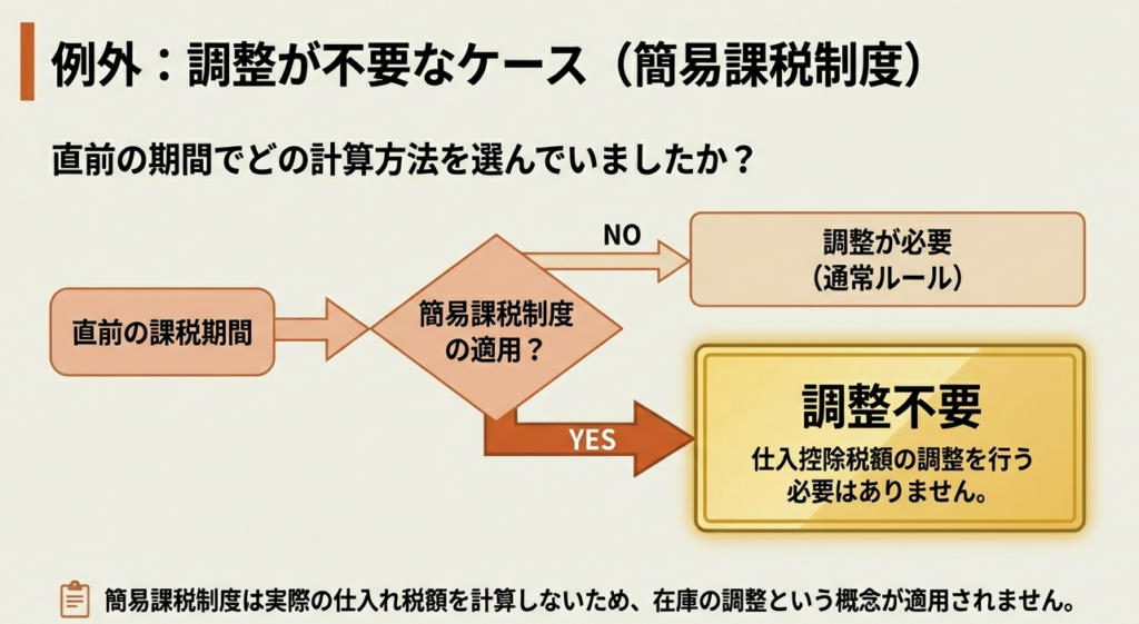 ただし、この調整には重要な例外があります。免税事業者となる直前の課税期間において簡易課税制度を適用していた場合には、この調整は不要です。