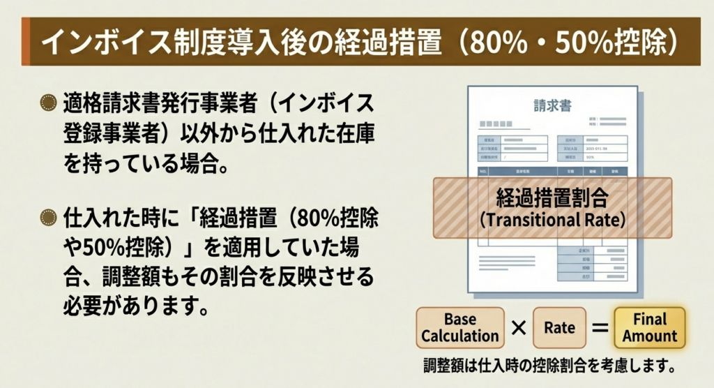 課税事業者から免税事業者になる際、インボイス制度の経過措置(いわゆる80%控除、50%控除)の適用を受けて仕入れた棚卸資産を保有している場合は、調整する税額の計算に特別な注意が必要です。調整額は、仕入税額相当額の全額ではなく、以下の割合を乗じた金額となります。