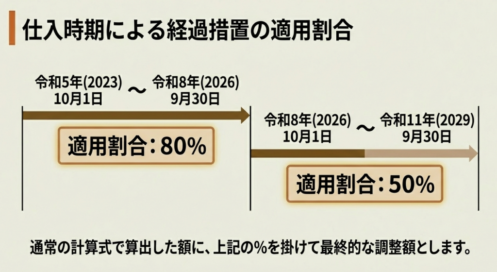 ◦ 令和8年10月1日~令和11年9月30日までの仕入れ: 仕入税額相当額に50%を乗じた金額を調整します。