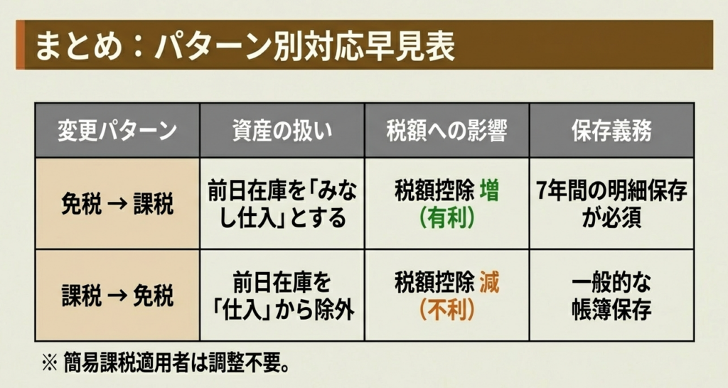 多忙な実務担当者の皆様のために、まずこの制度の要点を簡潔にまとめます。事業者の状況が変化した際に、棚卸資産にかかる消費税を最終的にどう扱うべきか、という結論は以下の通りです。