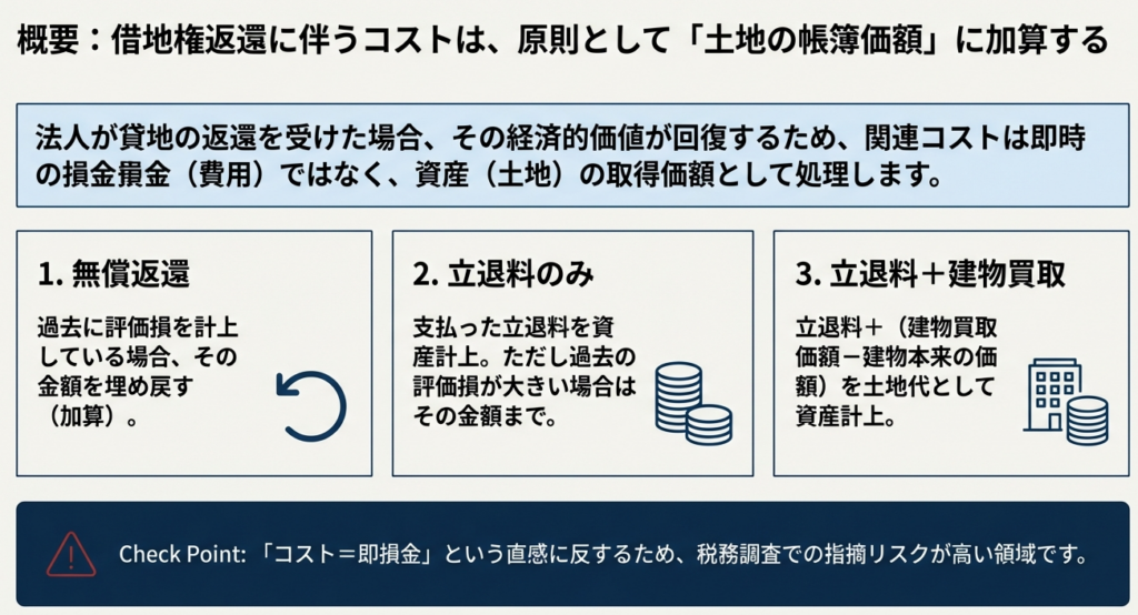 「法人が貸地の返還を受けた際、そのために支払った立退料等の費用や、過去に損金算入した金額は、原則としてその土地の帳簿価額に加算する」