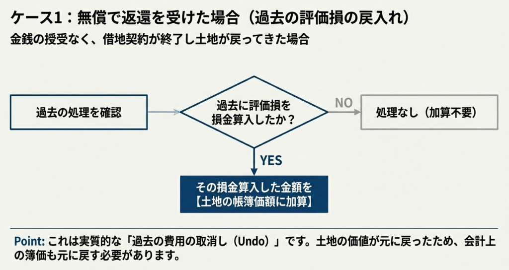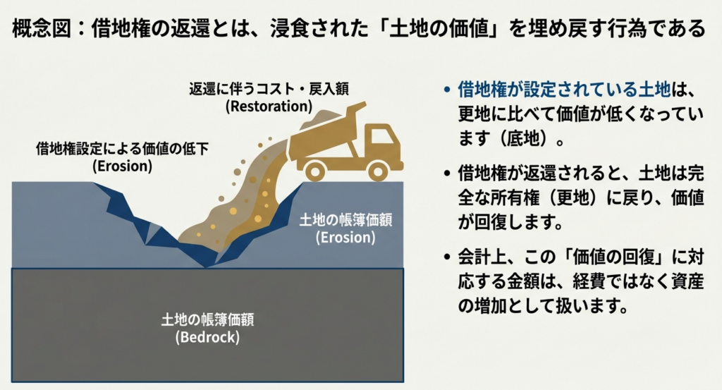 この処理の背景には、「権利状態の正常化」という考え方があります。過去に借地権を設定し、土地の利用が制約されたことで計上した損失は、今回、借地権が返還されて完全な所有権が回復したことにより、その損失の根拠が消滅したと見なされます。そのため、過去の損失計上額を土地の価値に戻す(洗い替える)ための会計上の調整が必要となるのです。