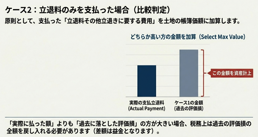 ただし、その支払った立退料等の金額よりも、上記3.1の金額(過去に損金算入した金額)が多い場合には、その金額(つまり、過去に損金算入した金額)を土地の帳簿価額に加算します。