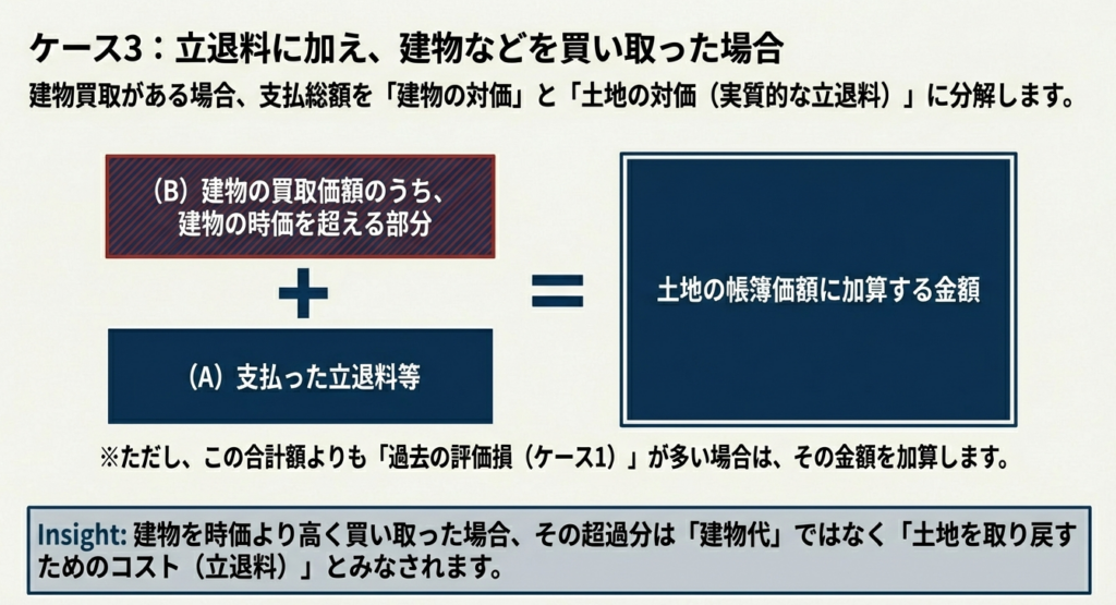 ここでいう「建物価額を超える部分」とは、実質的に借地権そのものを買い戻すための対価(権利金)と見なされます。建物自体の価値とは別に、土地の利用権を回復するために支払ったコストであるため、土地の取得原価に算入されるというロジックです。