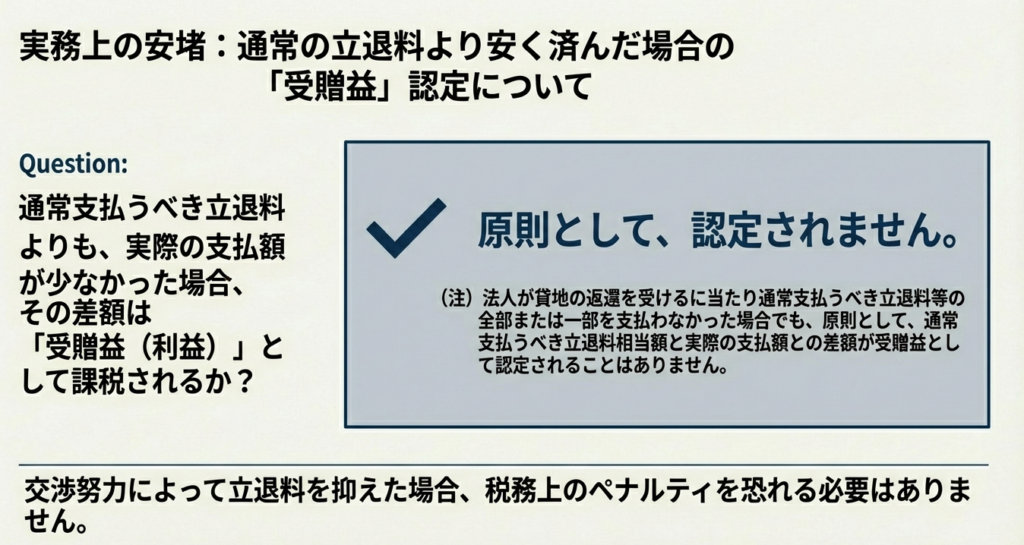 このルールは、地主側の予期せぬ課税リスクを排除する上で極めて重要です。借地人との合意により、相場より低い立退料で、あるいは無償で土地の返還を受けたとしても、地主側で「経済的利益を受けた」として受贈益課税が発生することはない、というのが原則的な取り扱いです。これにより、交渉の結果をストレートに会計処理に反映させることができ、税務上の不確実性が大幅に低減されます。