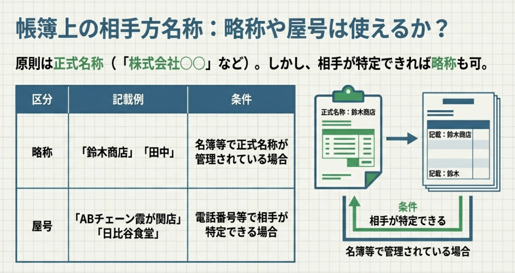 正式名称が記載された取引先名簿が備え付けられているなど、相手方が特定できる状況にあれば、「田中」や「鈴木商店」のような略称での記載が認められます。また、屋号等であっても、電話番号が明らかであるなど相手方が特定できれば差し支えありません。