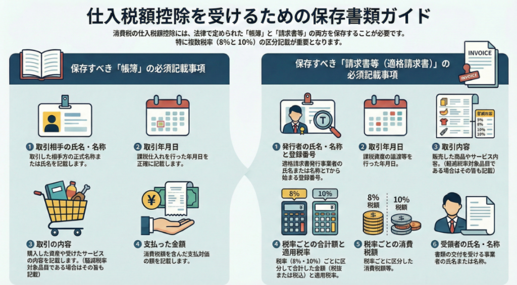 仕入税額控除の適用を受けるためには、原則として法定事項を記載した帳簿および請求書等(適格請求書など)の保存が必要です。また、複数税率に対応するため、取引を税率ごとに分ける区分経理を行う必要があります。