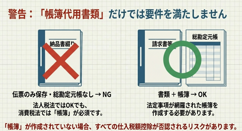 認められません。法人税法上の「帳簿代用書類」は、消費税の仕入税額控除の要件とされる帳簿には該当しないため、それだけでは帳簿の保存要件を満たしたことにはなりません。法定事項が記載された帳簿を別途作成・保存する必要があります。