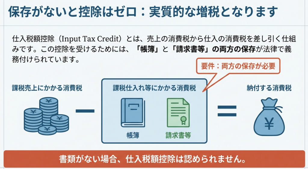 繰り返しになりますが、どちらか一方だけでは仕入税額控除の要件を満たしません。この2つは常にセットで保存・管理することを徹底してください。