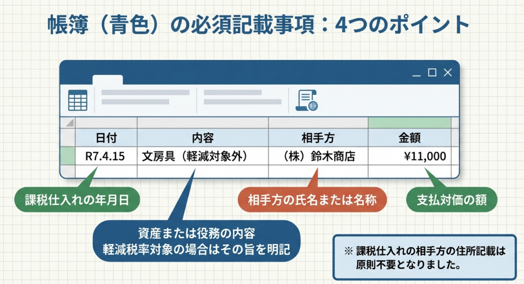 一般的な商品購入やサービス利用の際に、帳簿に記載すべき事項は以下の4点です。これらの情報は、後述する3.2 (1) の適格請求書などから転記または要約して作成するのが基本となります。
