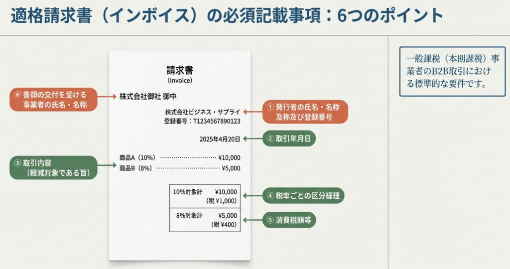 帳簿の記載要件を理解したところで、次にもう一方の重要な書類である「請求書等」について見ていきましょう。