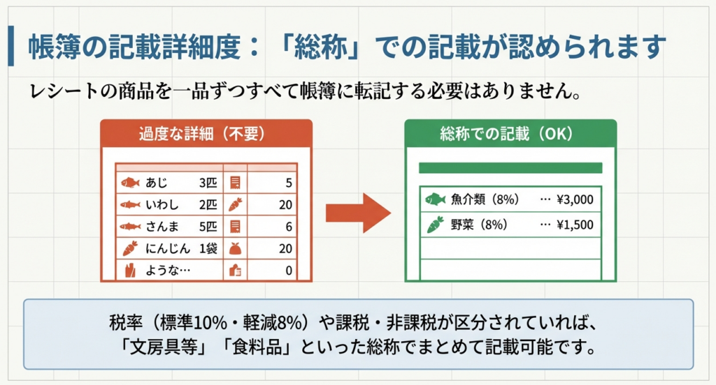 A1. 必ずしも完全に一致させる必要はありません。 例えば、鮮魚店からの請求書に「あじ○匹、いわし○匹」と詳細な記載があっても、帳簿への記載は「食料品」や「魚類」といった一般的な総称でまとめて記載して差し支えありません。重要なのは、申告時に個々の請求書を都度確認しなくても、帳簿だけで仕入内容が把握できる程度に記載されていることです。これは、税務調査の際にも、帳簿と請求書等の突合がスムーズに行えるようにするという実務的な観点からも重要です。