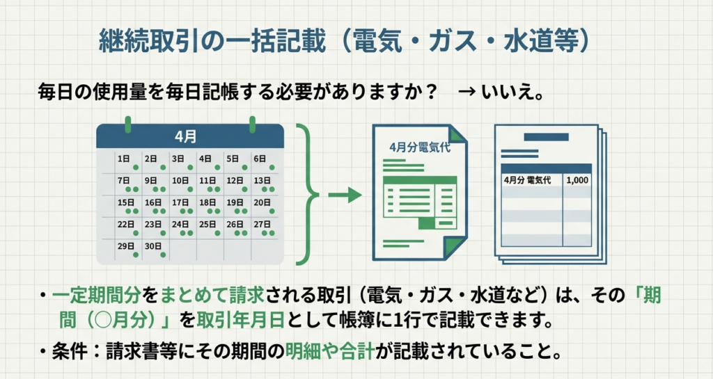 A3. 可能です。 電気代や水道代のように継続的に供給されるサービスや、毎月同じ取引先から商品を仕入れる場合など、請求書が月単位で発行されるケースでは、帳簿の記載も「○月分」としてまとめて記載して問題ありません。