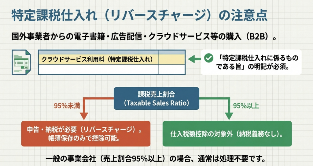 特定課税仕入れとは、国外事業者から受けた事業者向け電気通信利用役務の提供や、芸能・スポーツ等の役務提供を指します。課税売上割合が95パーセント未満の場合にリバースチャージ方式が適用され、帳簿のみの保存で仕入税額控除ができます。