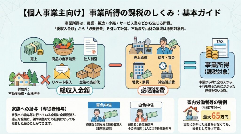 総収入金額には、売上金額に加え、商品の自家消費やリベート収入、空箱の売却代金なども含まれます。必要経費は、売上原価や従業員の給与、地代家賃など、収入を得るために直接必要な費用を指します。原則として生計を一にする親族への給与は経費になりませんが、青色申告や白色申告の要件を満たすことで、一定額を経費(専従者給与・控除)に算入できる特例があります。