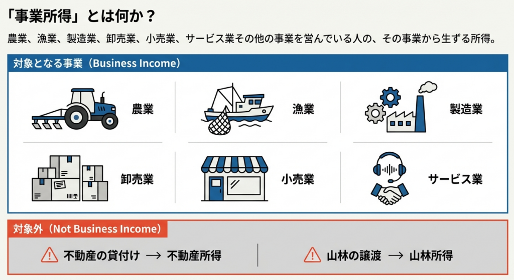 一見シンプルな引き算ですが、この枠組みを正しく適用するためには「所得区分」の峻別が絶対条件です。所得税法第27条は、不動産の貸付けによる「不動産所得」や、山林の伐採・譲渡による「山林所得」を、原則として事業所得から除外しています。