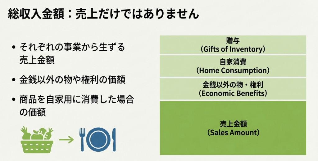 第4問: 「総収入金額」には、通常の売上金額以外にどのような経済的利益が含まれますか?