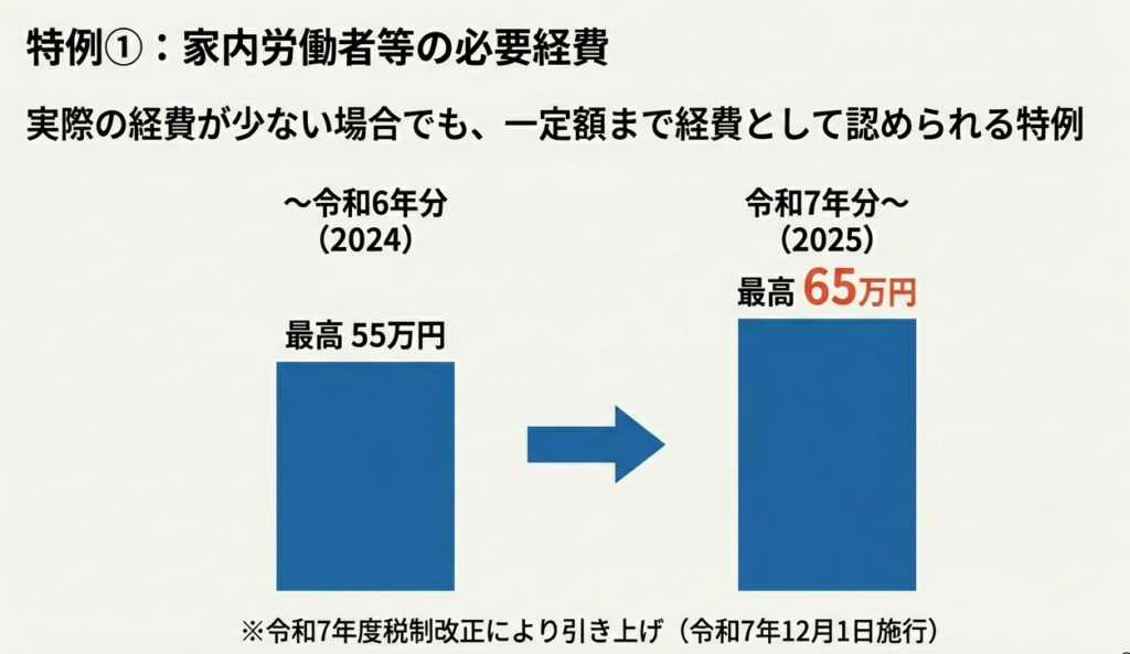 必要経費の額が65万円に満たない場合、最高65万円まで必要経費として認める特例があります。この金額は令和7年12月施行の法令に基づき、令和7年分から適用されるものです。