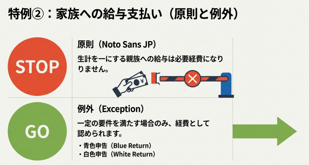 原則として生計を一にする親族への給与は経費になりませんが、以下の特例があります。