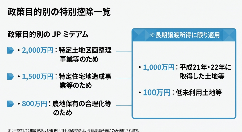 特に「平成21・22年取得土地」と「低未利用土地」の控除は、長期譲渡所得(所有期間5年超)にしか適用されないという注釈が重要です。また、これらを組み合わせて使う場合でも、年間合計で5,000万円を超えることはできません。「複数の特例が使えるから、1億円控除できる」といった誤解をクライアントに与えないよう、釘を刺しておくのがプロの仕事です。