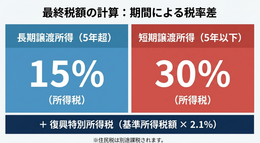 税額は、給与所得などと合算しない「分離課税」で計算されます。税率は、所有期間が5年を超える「長期譲渡所得」なら15%、5年以下の「短期譲渡所得」なら30%(別途、復興特別所得税が必要)となります。