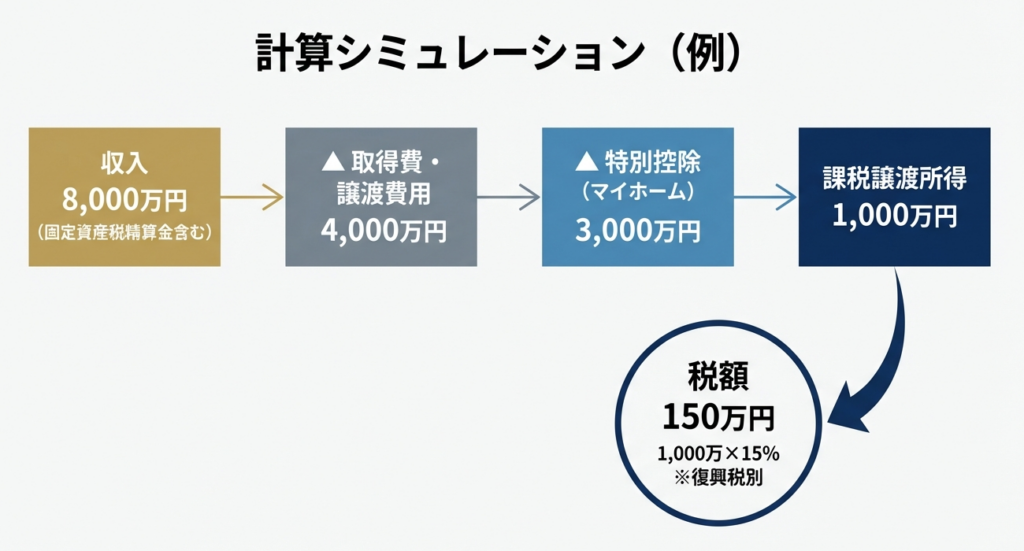 所得金額は「収入金額 -(取得費 + 譲渡費用)- 特別控除額」で計算します。収入金額には金銭だけでなく、固定資産税の精算金などの経済的利益も含まれます。特別控除には、マイホームを売却した場合の最大3,000万円控除などがあります。