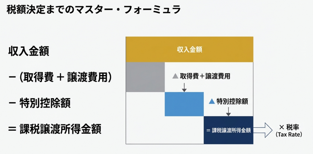 土地や建物の譲渡所得計算は、一見すると特例が多くて複雑に思えるかもしれませんが、その骨組みは非常にシンプルです。まずは、以下の基本算定式を確実にマスターしてください。