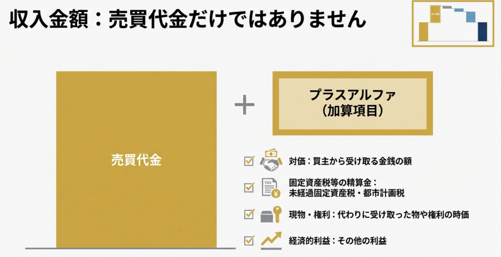 売買代金のほかに、買主から支払を受ける未経過固定資産税・都市計画税の精算金が収入金額に算入されます。また、金銭の代わりに受け取った物や権利の時価、および譲渡によって受けた経済的利益も含まれます。