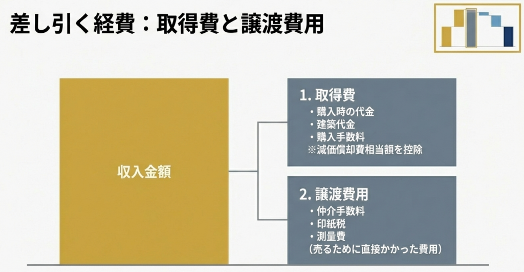 • 取得費・譲渡費用: 資産の買い入れ代金や、仲介手数料などの売却に直接要した経費です。